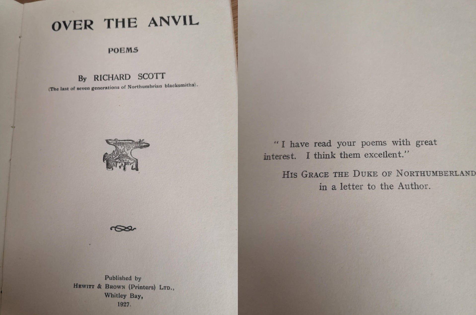Manager Rob Mutter recently discovered a book of poems from 1927, ‘Over The Anvil’ written in a northern dialect by a Northumbrian blacksmith called Richard Scott. Inside was a handwritten dedication: “To John Scott Todd, my father’s book of poems, from Edith”.